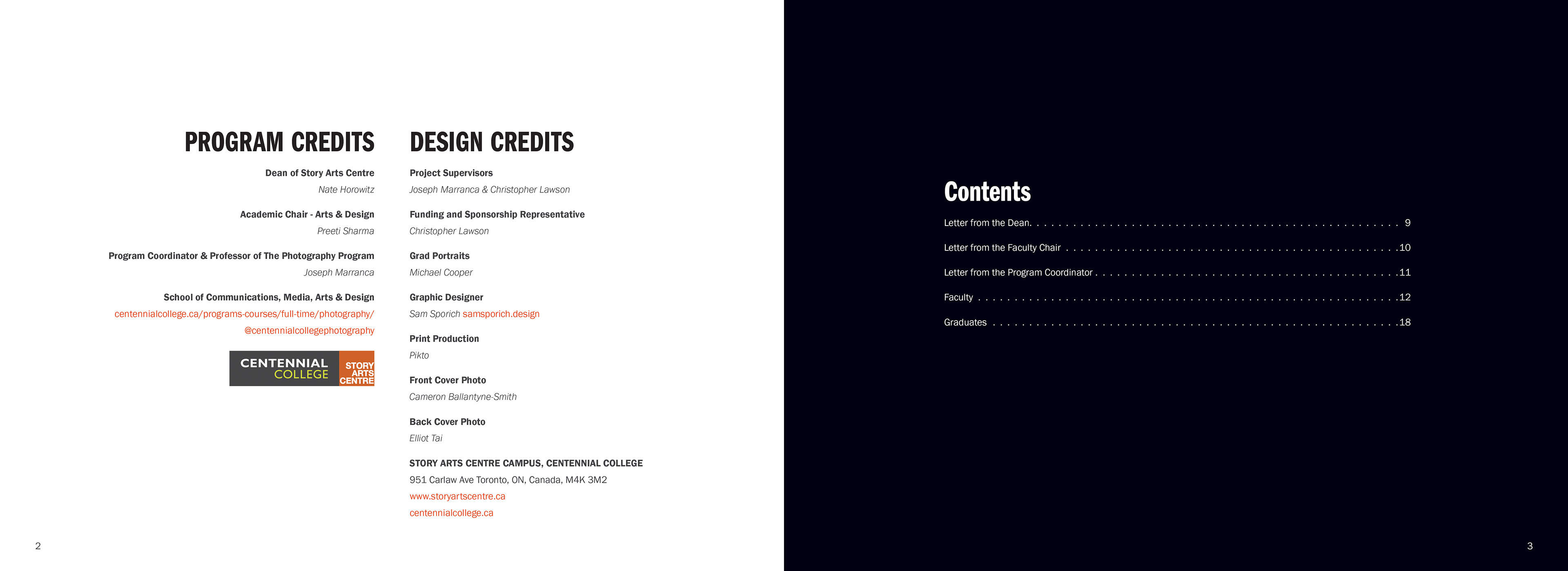 Designed the Centennial College photography program 2024 graduation portfolio. Communicated with the printer and delivered a print-ready PDF in correct colour profile. Organized and coordinated with the graduating students to receive their photos. Edited bios for spelling and grammar. Communicated with sponsors, providing them specs and placing their advertisements in the book.